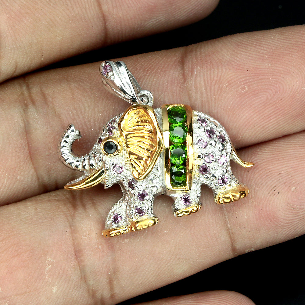 Anhänger Elefant mit russischen Diopsiden, Rhodoliten und einem blauen Saphir gefasst in 925er Sterlingsilber 14 Karat Weißgold und Gelbgold vergoldet